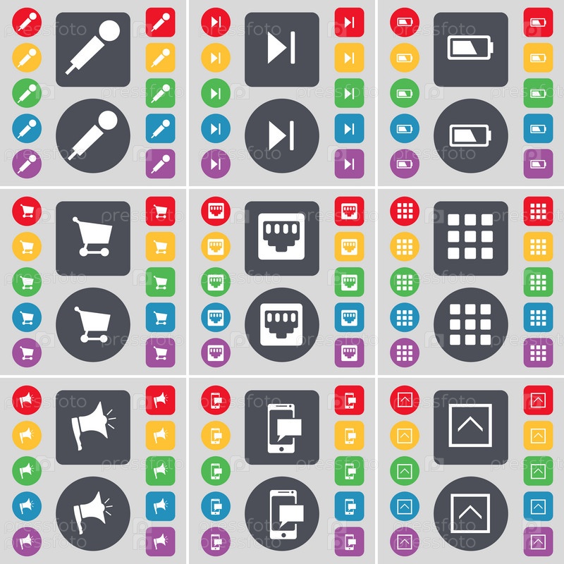 Микрофон, СМИ пропускать, батарея, корзина, выключатель LAN, приложения, Мегафон, SMS, стрелка вверх значок символа. Большой набор плоских цветных кнопок для вашего дизайна. вектор