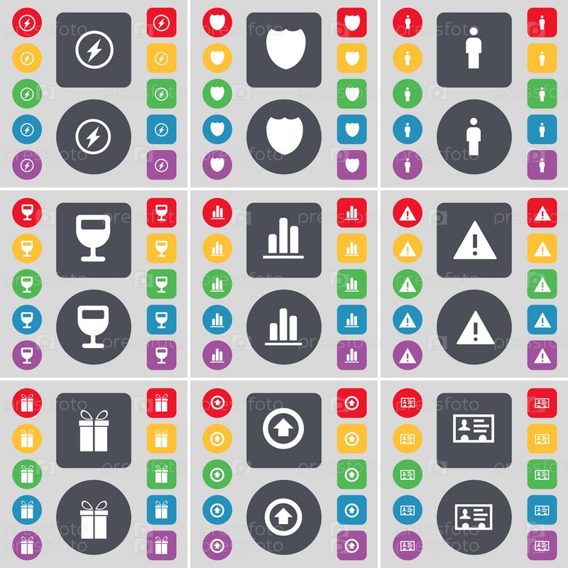 Вспышка, знак, силуэт, Wineglass, диаграмма, предупреждение, подарок, стрелка вверх, символ значка контакта. Большой набор плоских цветных кнопок для вашего дизайна. вектор