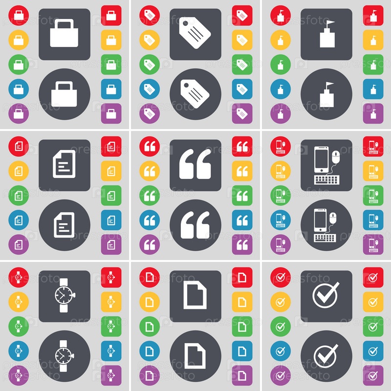Флаг блокировки, тег, башня, текстовый файл, цитаты марка, смартфон, наручные часы, файл, тик значок символ. Большой набор плоских, цветные кнопки для вашего дизайна. Вектор