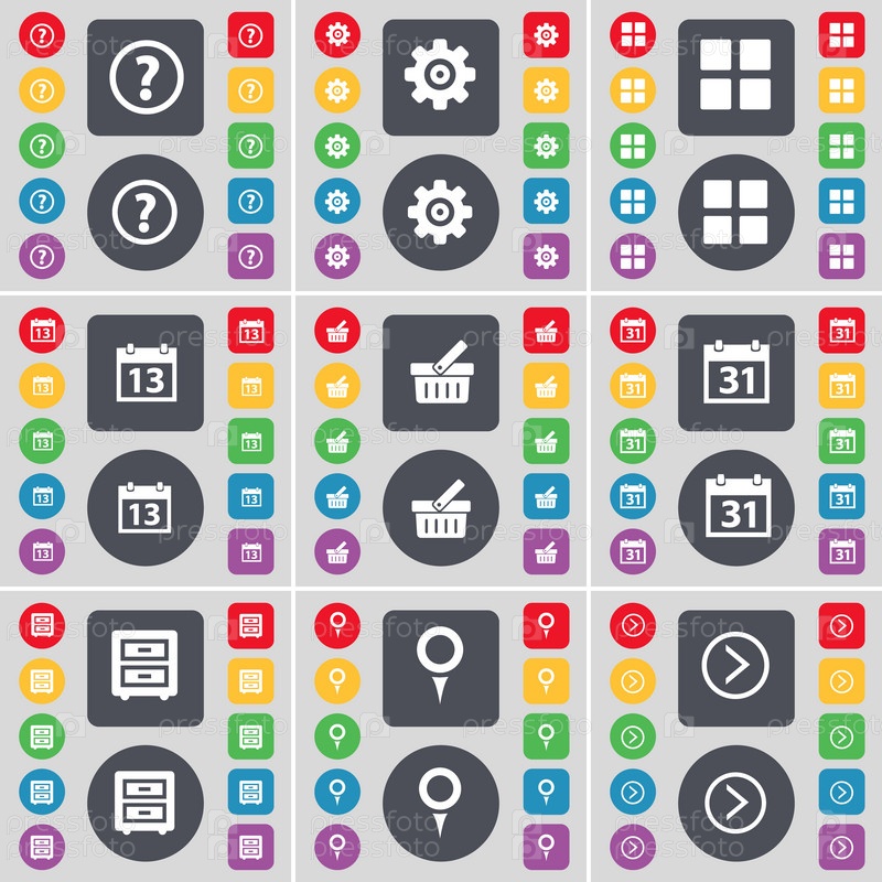 Вопросительный знак, оборудование, приложения, календарь, корзина, календарь, постельный стол, контрольно-пропускной пункт, справа Иконка стрелка. Большой набор плоских цветных кнопок для вашего дизайна. вектор