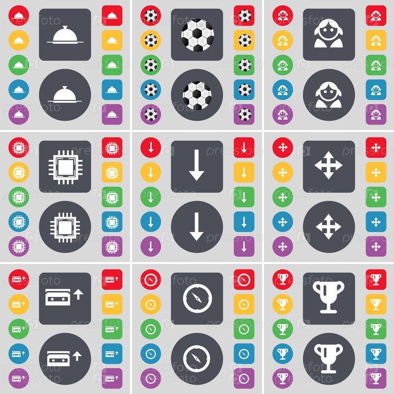 Лоток, мяч, аватар, процессор, стрелка вниз, перемещение, кассеты, компас, Кубок значок символа. Большой набор плоских, цветные кнопки для вашего дизайна. Вектор