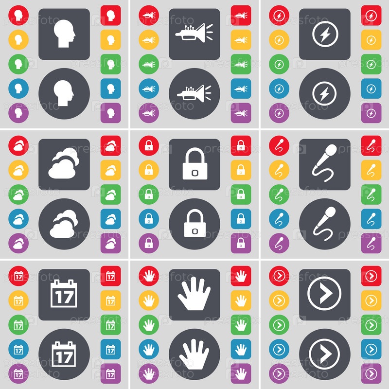 Силуэт, Trumped, Flash, облако, замок, микрофон, календарь, рука, стрелка направо значок символа. Большой набор плоских цветных кнопок для вашего дизайна. вектор