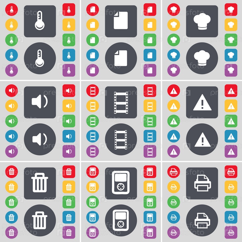 Термометр, файл, приготовление шляпу, звук, негативных пленок, предупреждение, мусорные урны, игрок, символ значок принтера. Большой набор плоских, цветные кнопки для вашего дизайна. Вектор