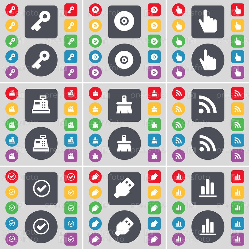 Ключ, диск, рука, касса, кисть, RSS-контент, тик, USB, график значок символа.Большой набор плоских цветных кнопок для вашего дизайна.Вектор