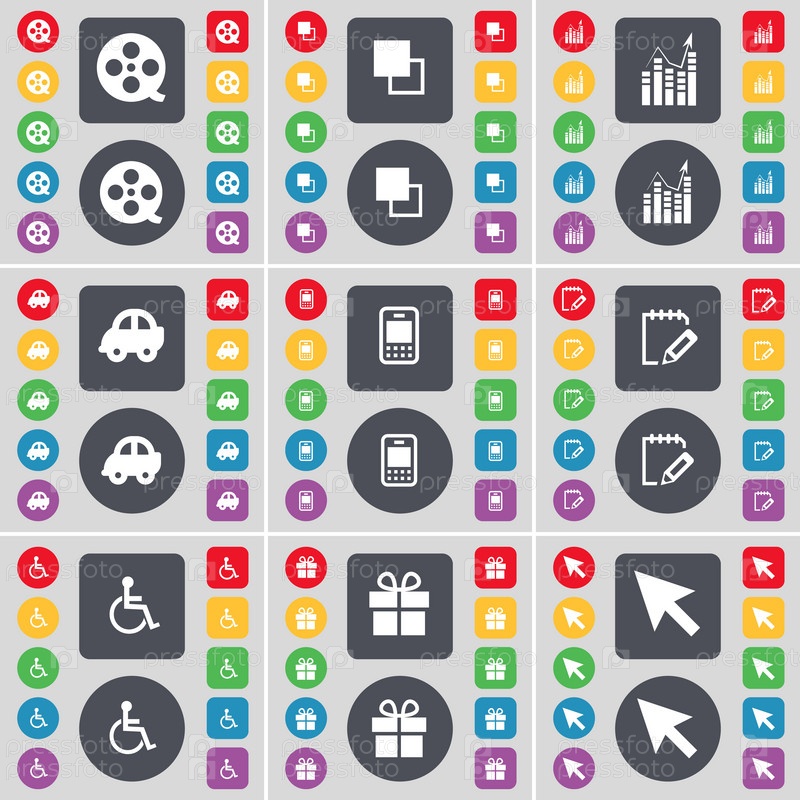 Видеозапись, копирования, диаграмма, автомобиль, мобильный телефон, ноутбук, инвалидов лица, подарок, курсор значок символа. Большой набор плоских, цветные кнопки для вашего дизайна. Вектор