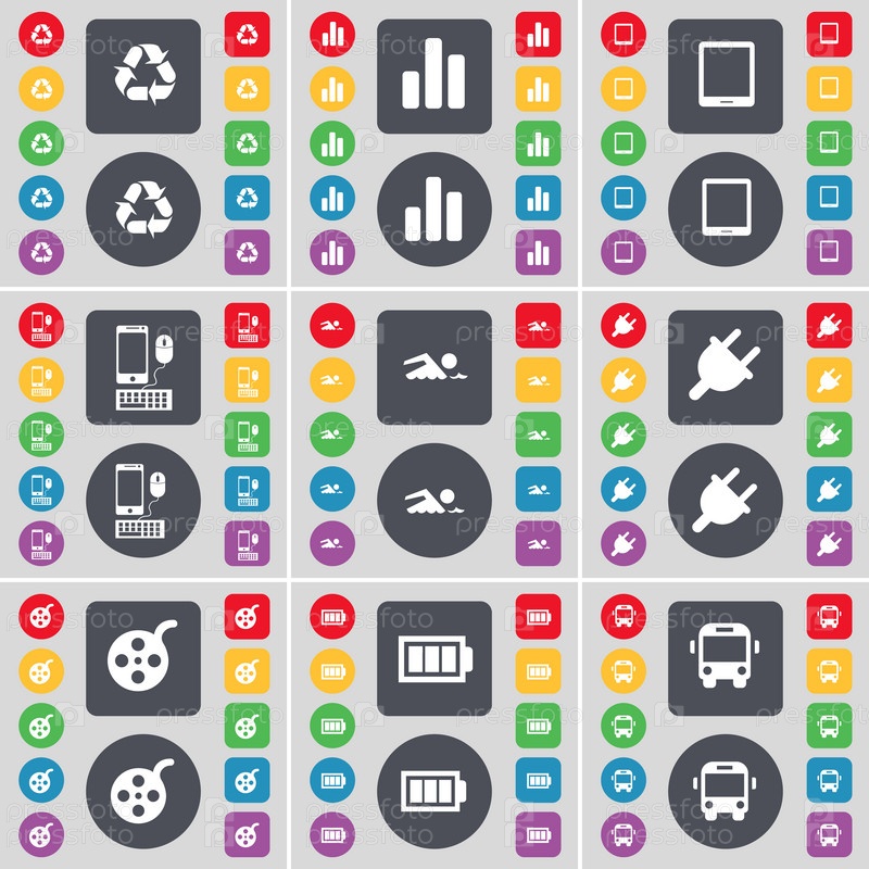Переработка, диаграмма, планшетный ПК, смартфон, плаватель, гнездо, видеозапись, аккумулятор, шины значка символа. большой набор плоских цветных кнопок для вашего дизайна. вектор