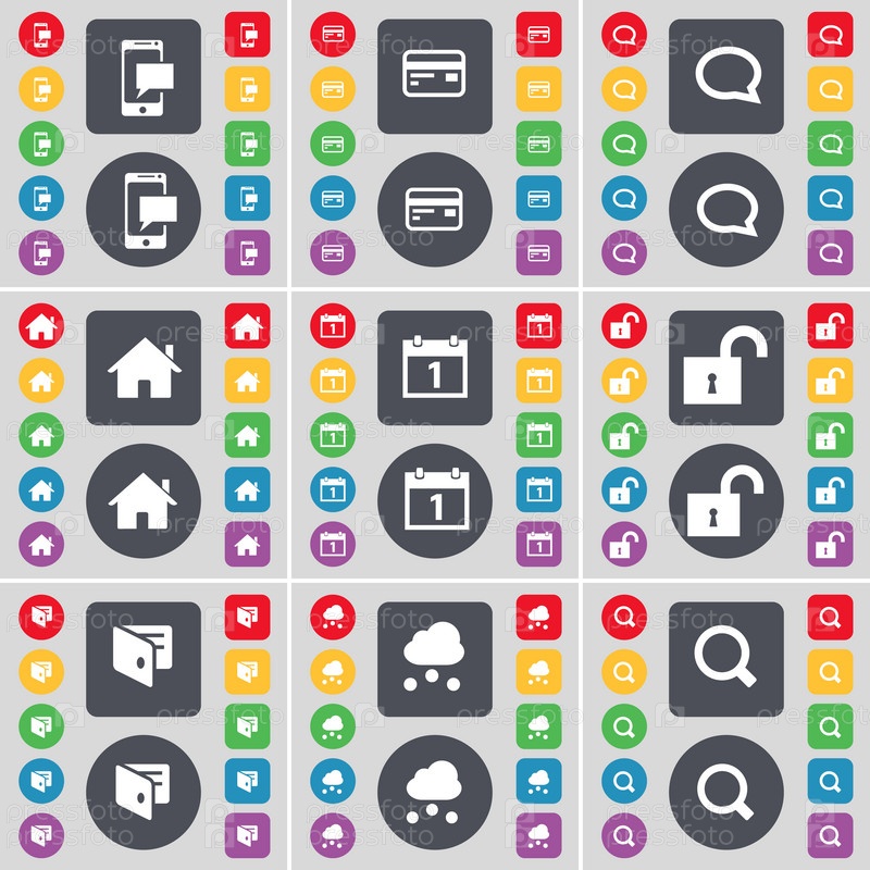 СМС, кредитная карта, чат-пузырь, дом, календарь, замок, кошелек, облако, увеличивающее стекло иконка символа. большой набор плоских цветных кнопок для вашего дизайна. вектор