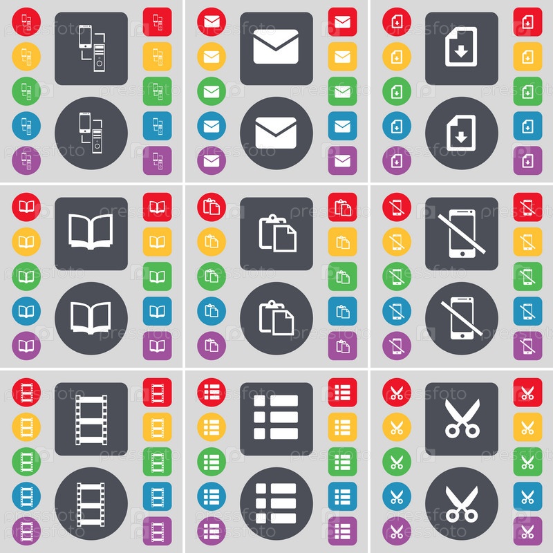 Связи, сообщение, скачать файл, книга, обзор, смартфон, негативных пленок, список, ножницы значок символа. Большой набор плоских, цветные кнопки для вашего дизайна. Вектор