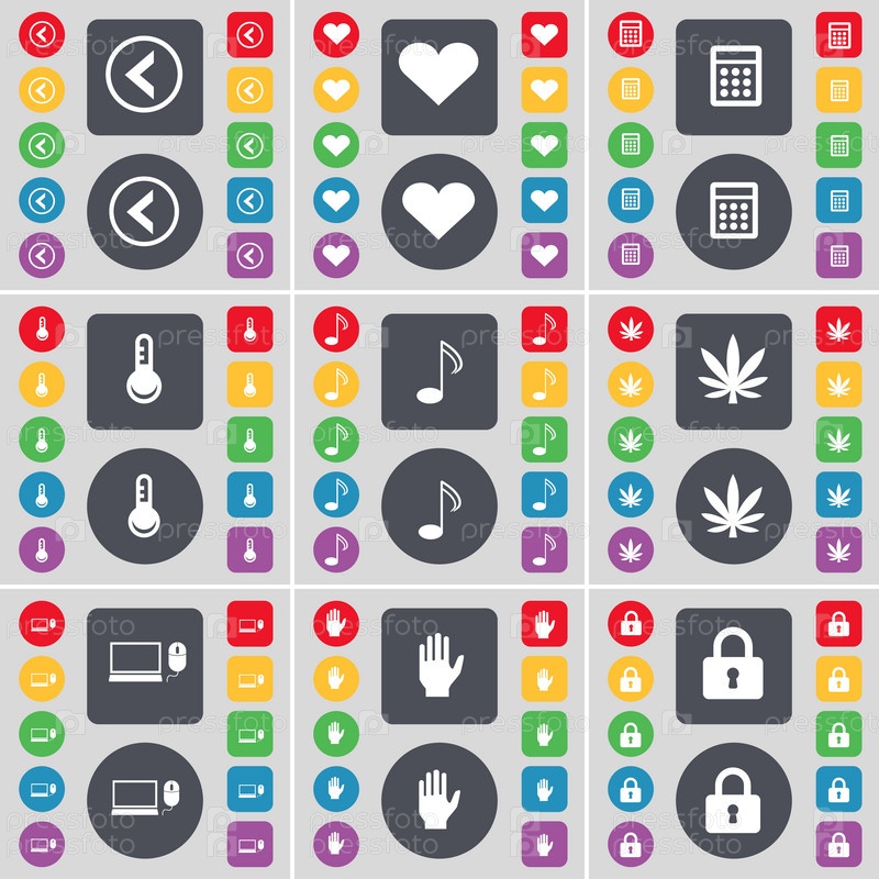 Стрелка влево, сердце, калькулятор, Примечание, марихуаны, ноутбук, рука, символ значок замка. Большой набор плоских, цветные кнопки для вашего дизайна. Вектор