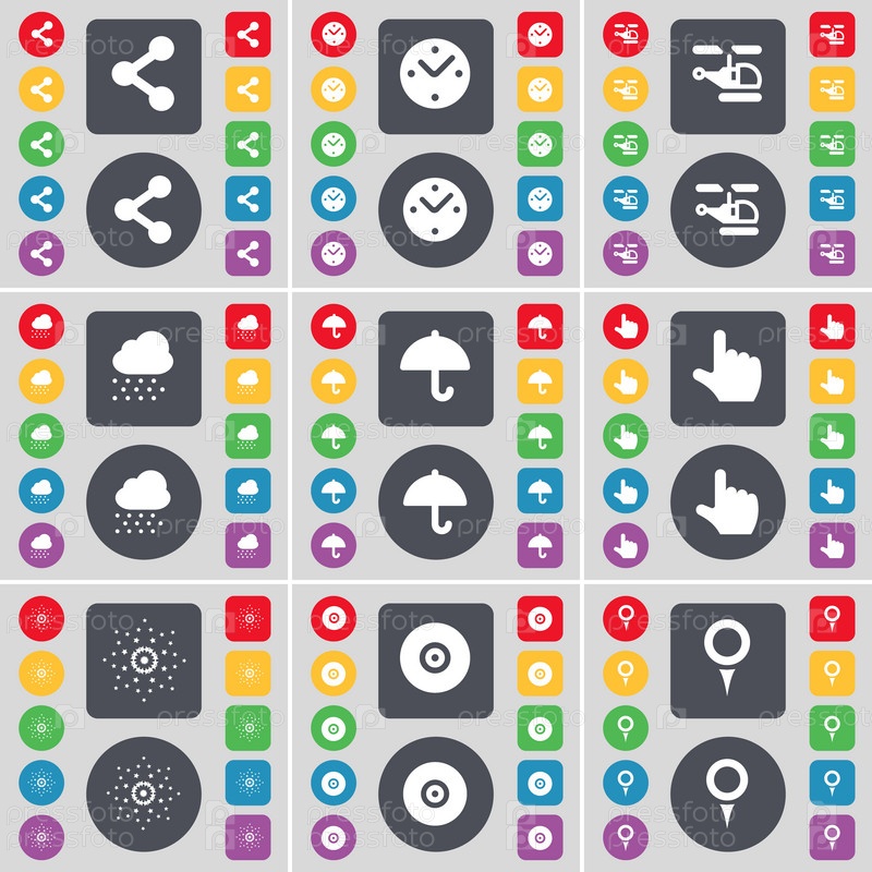 Доля, часы, вертолет, облако, зонтик, рука, звезда, диск, символ значок контрольной точки. Большой набор плоских, цветные кнопки для вашего дизайна. Вектор