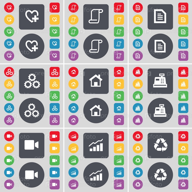 Сердце, прокрутки, текстовый файл, Гир, дом, кассовый аппарат, кинокамера, граф, обработка значка символа.Большой набор плоских цветных кнопок для вашего дизайна.Вектор