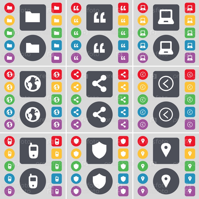 Папка, кавычки, ноутбук, земля, доля, стрелка влево, мобильный телефон, знак, символ значок контрольной точки. Большой набор плоских, цветные кнопки для вашего дизайна. Вектор