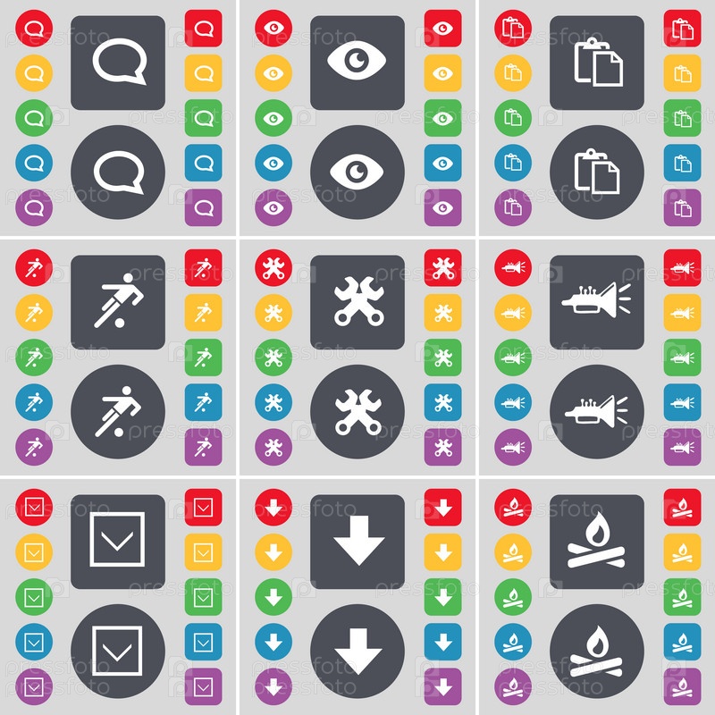 Чат пузырь, видение, исследования, футбол, гейковерт, Trumped, стрелка вниз, огонь значок символа. большой набор плоских цветных кнопок для вашего дизайна. вектор