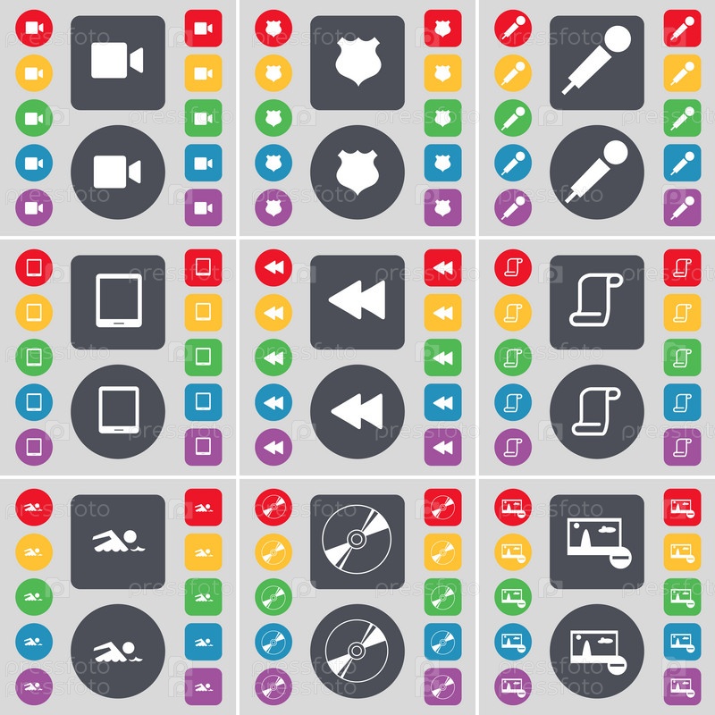 Пленочная камера, значок полиции, микрофон, планшетный компьютер, Rewind, прокрутки, плаватель, диск, картинка икона символа. большой набор плоских цветных кнопок для вашего дизайна. вектор