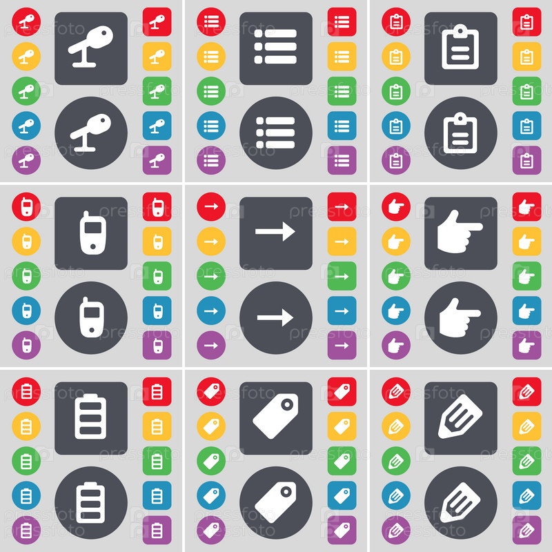 Микрофон, список, опрос, мобильный телефон, стрелку справа, рука, батареи, тег, символ значок карандаша. Большой набор плоских, цветные кнопки для вашего дизайна. Вектор