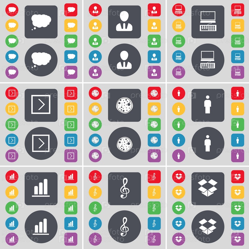Облако чата, аватар, ноутбук, стрелка направо, пицца, силуэт, диаграмма, скрипичная клавиша, символ значка Dropbox. Большой набор плоских цветных кнопок для вашего дизайна. вектор
