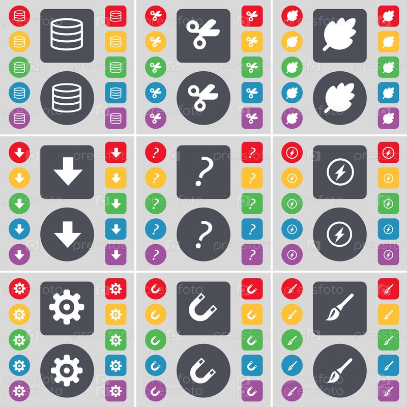 Базы данных, ножницы, лист, стрелка вниз, вопросительный знак, Флэш, оборудование, магнит, щетка значок символа. большой набор плоских цветных кнопок для вашего дизайна. вектор