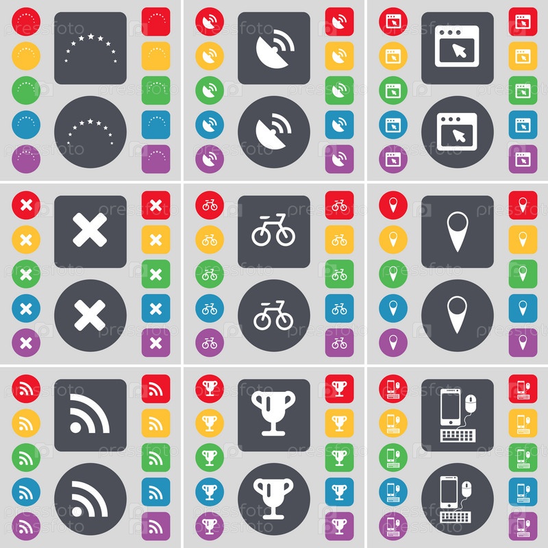 Звезды, Спутниковая тарелка, окна, остановки, велосипеды, контрольно-пропускной пункт, RSS, Кубок, символ значка смартфона. Большой набор плоских цветных кнопок для вашего дизайна. вектор