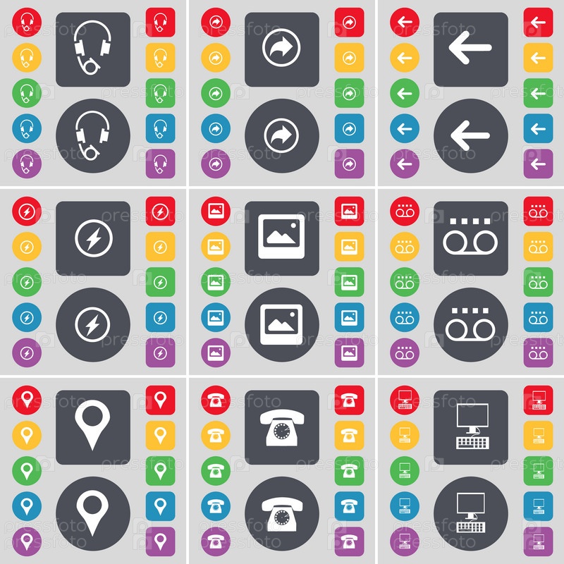 Наушники, назад, влево, Флэш, окна, кассеты, контрольно-пропускной пункт, ретро телефон, значок символа ПК. Большой набор плоских цветных кнопок для вашего дизайна. вектор