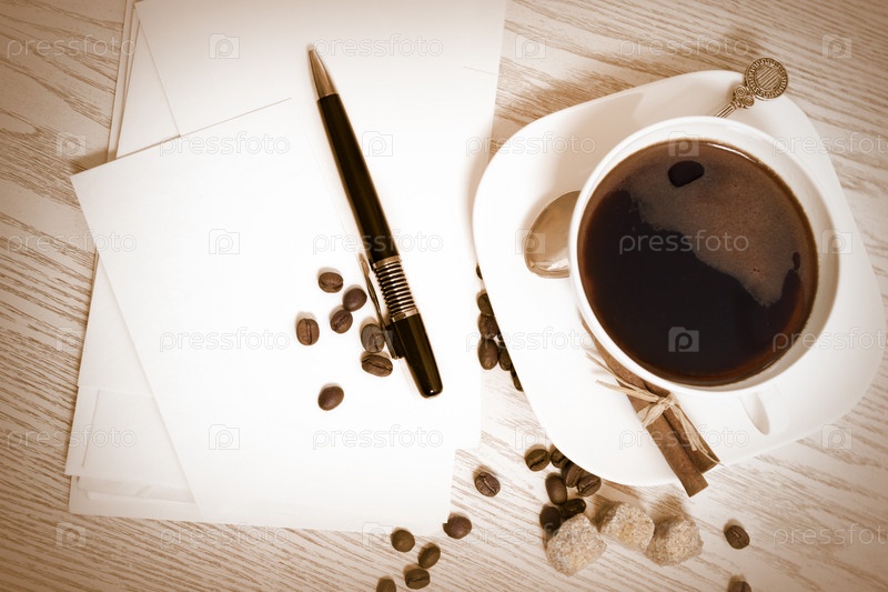 Чашка кофе с корицей, чистая бумага и ручка на столе