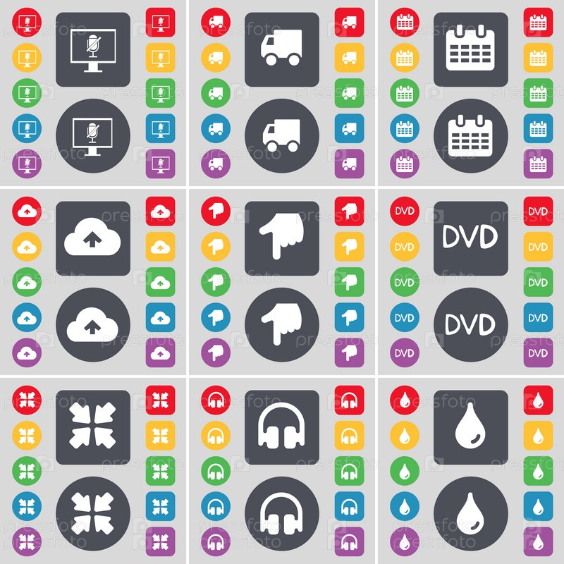 Монитор, грузовик, календарь, облако, рука, DVD, раскрытие экрана, наушники, падающие значки символов. Большой набор плоских цветных кнопок для вашего дизайна