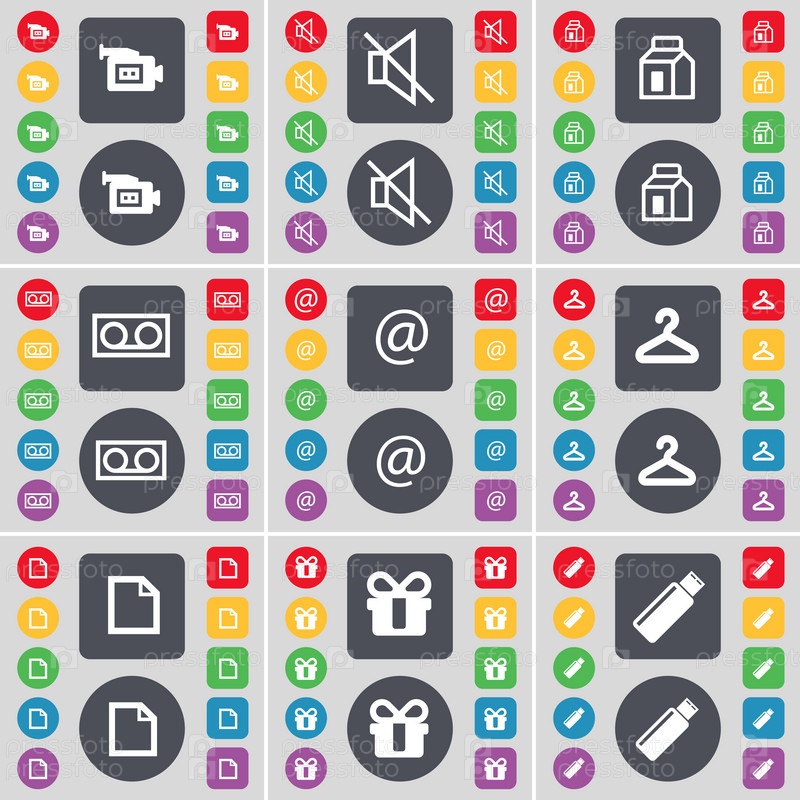 Кинокамера, молчание, упаковка, кассеты, почта, вешалка, файл, подарок, значок символа USB. Большой набор плоских цветных кнопок для вашего дизайна. вектор