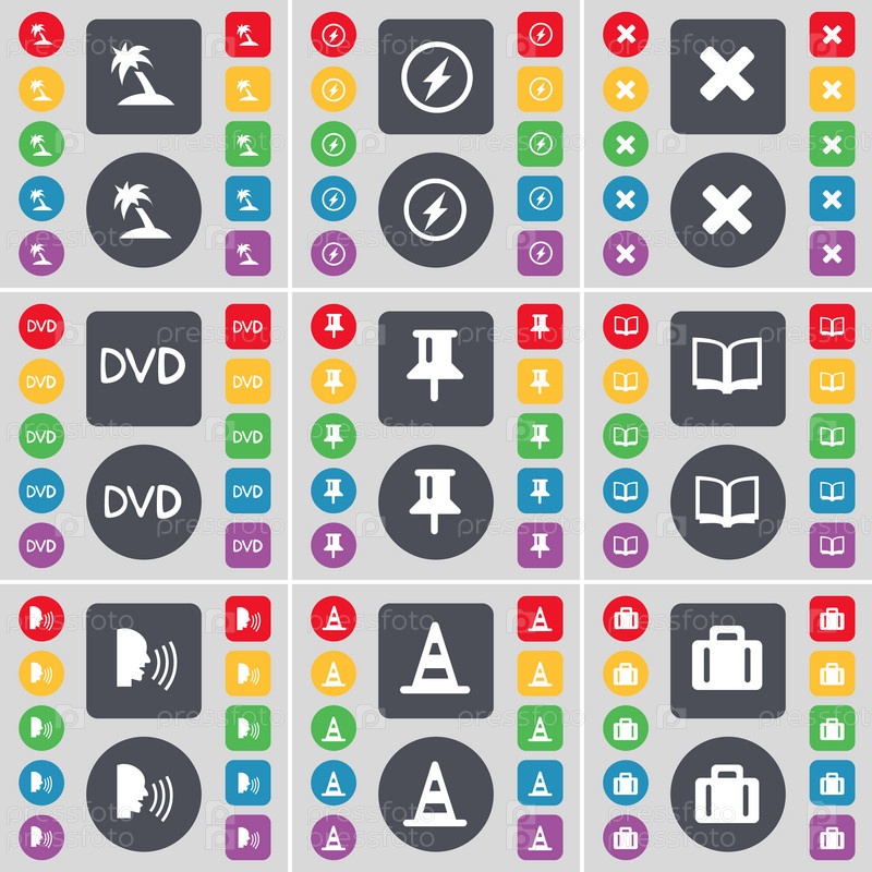 Ладонь, Флэш, Стоп, DVD, Пин, Книга, Разговор, Конус, Иконка символа чемодана Большой набор плоских цветных кнопок для вашего дизайна