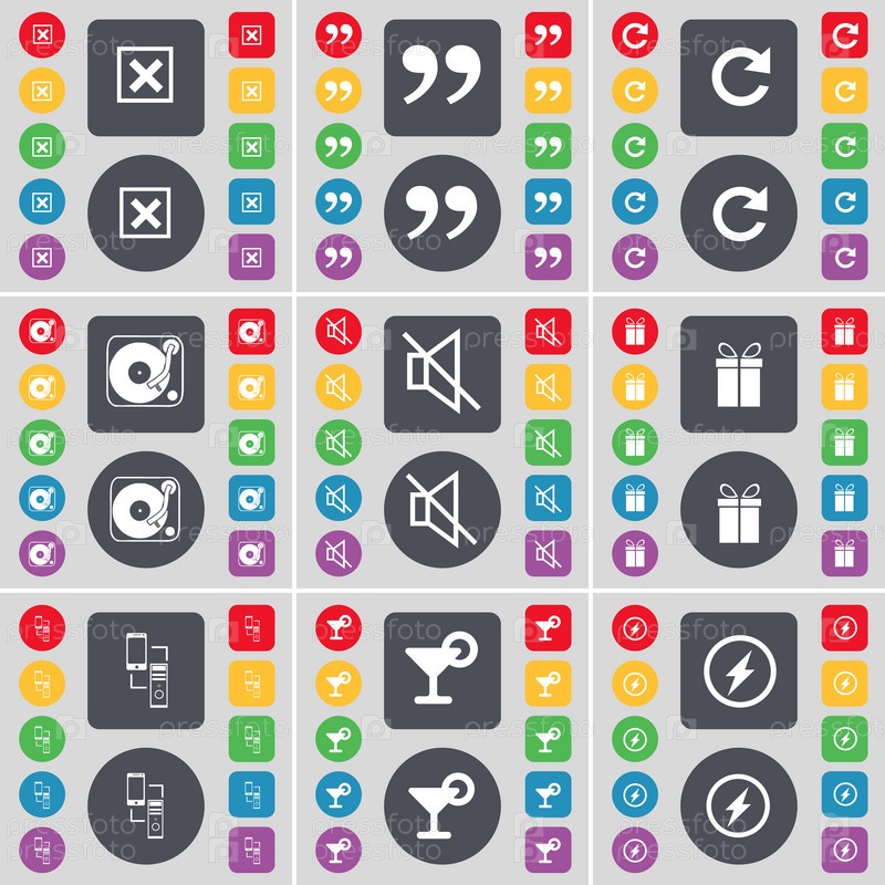 Стоп, запятые, перезагрузка, граммофон, заглушить звук, подарок, связь, коктейль, значок символа Flash. большой набор плоских цветных кнопок для вашего дизайна. вектор