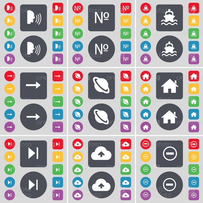 Разговоры, номер, корабль, стрелка вправо, планета, дом, СМИ пропустить, облако, минус значок символа. Большой набор плоских, цветные кнопки для вашего дизайна. Вектор