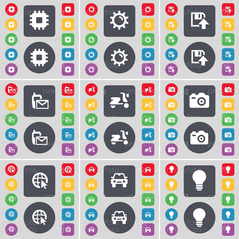 Процессор, оборудование, флопи, SMS, скутер, камера, веб-курсор, автомобиль, лампа иконка символа. большой набор плоских цветных кнопок для вашего дизайна. вектор