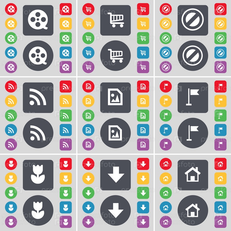 Видеозапись, торговые карты, остановка, RSS, медиафайлы, гольф-луночка, цветок, стрелка вниз, дом значок символа. большой набор плоских цветных кнопок для вашего дизайна. вектор