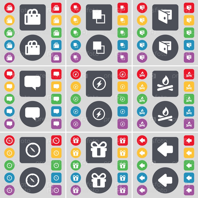 Торговый пакет, копировать, кошелек, чат-пузырь, Флэш, огонь, компас, подарок, стрелка слева от символа значка. Большой набор плоских цветных кнопок для вашего дизайна. вектор