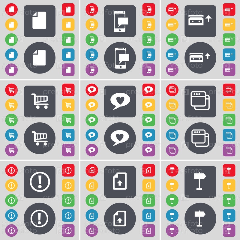 Файл, СМС, кассета, корзина, пузырь чата, окна, восклицательный знак, файл, указатель значок символа. большой набор плоских цветных кнопок для вашего дизайна. вектор