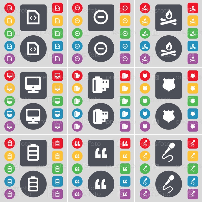 Файл, минус, костра, монитор, негативных пленок, полиции значок, батарея, кавычки, символ значок микрофона. Большой набор плоских, цветные кнопки для вашего дизайна. Вектор