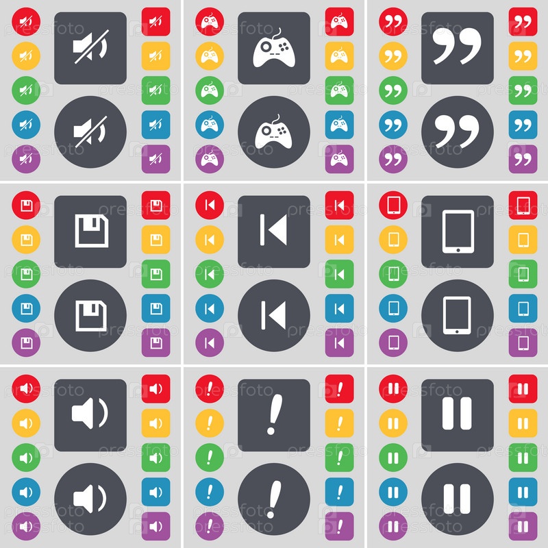 Немой, геймпад, запятые, дискеты, СМИ скип, Таблетный ПК, звук, восклицательный знак, символ значка паузы. Большой набор плоских цветных кнопок для вашего дизайна. вектор