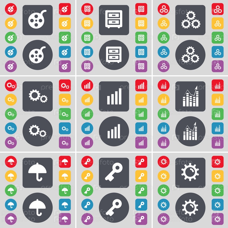 Видеозапись, постельные таблицы, Гир, диаграмма, график, зонтик, значок символа ключа. Большой набор плоских цветных кнопок для вашего дизайна. Вектор