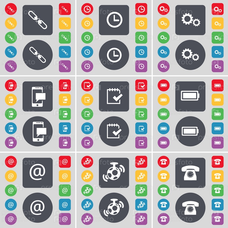 Связь, будильник, редуктор, SMS-сообщения, опросы, батарея, почта, динамик, символ ретро телефонного значка. Большой набор плоских цветных кнопок для вашего дизайна. вектор