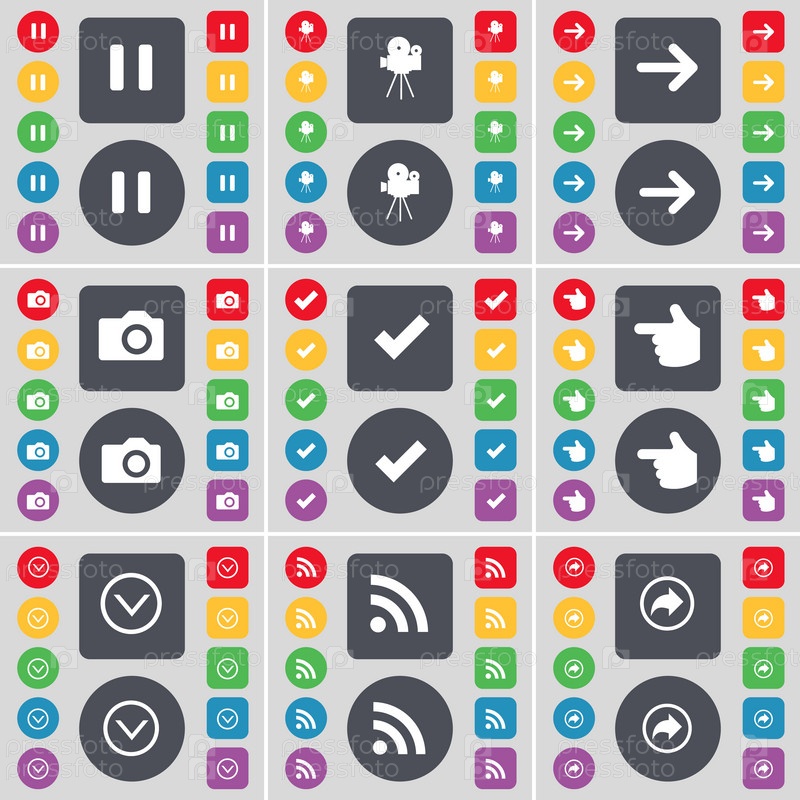 Пауза, пленочная камера, стрелка направо, камера, тик, рука, стрелка вниз, RSS, обратно значок символа. большой набор плоских цветных кнопок для вашего дизайна. вектор