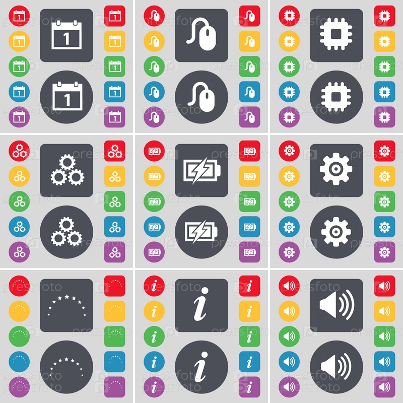 Календарь, мышь, процессор, снаряжение, зарядка, звезды, информация, символ значок звука. Большой набор плоских, цветные кнопки для вашего дизайна. Вектор