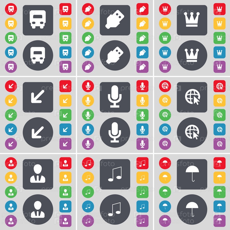 Грузовик, USB, Корона, разворачивающийся экран, микрофон, веб-курсор, аватар, примечание, зонтик иконка символа. большой набор плоских цветных кнопок для вашего дизайна. вектор