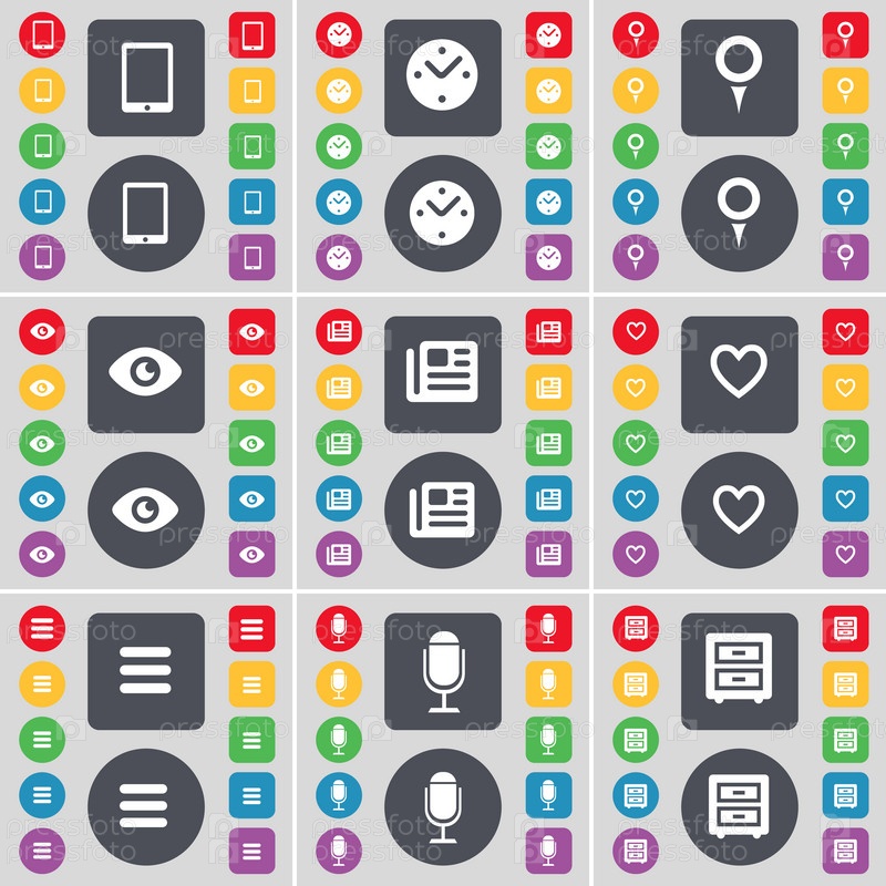 Таблетные ПК, часы, контрольно-пропускной пункт, видение, газета, сердце, приложения, микрофон, тумбочка значок символа. большой набор плоских цветных кнопок для вашего дизайна. вектор