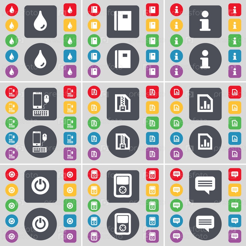 Drop, ноутбук, информация, смартфон, ZIP корзина, файловые схемы, власть, игрок, чат пузырь значок символа. большой набор плоских цветных кнопок для вашего дизайна. вектор