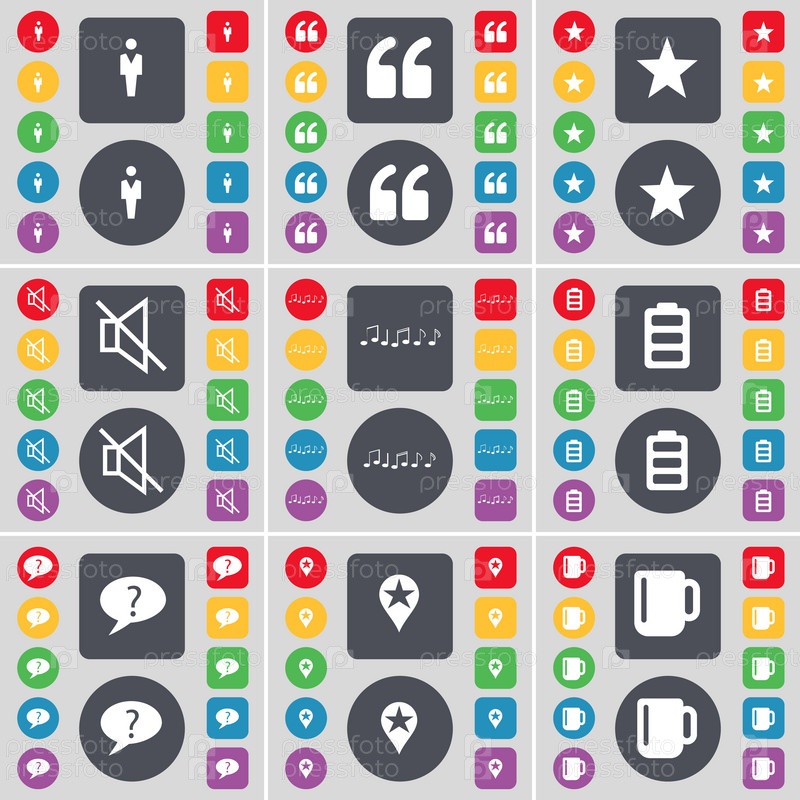 Силуэт, цитата Марк, звезда, Мутный, Примечание, батарея, пузырь чата, контрольно-пропускной пункт, Кубок значок символа. Большой набор плоских цветных кнопок для вашего дизайна. вектор