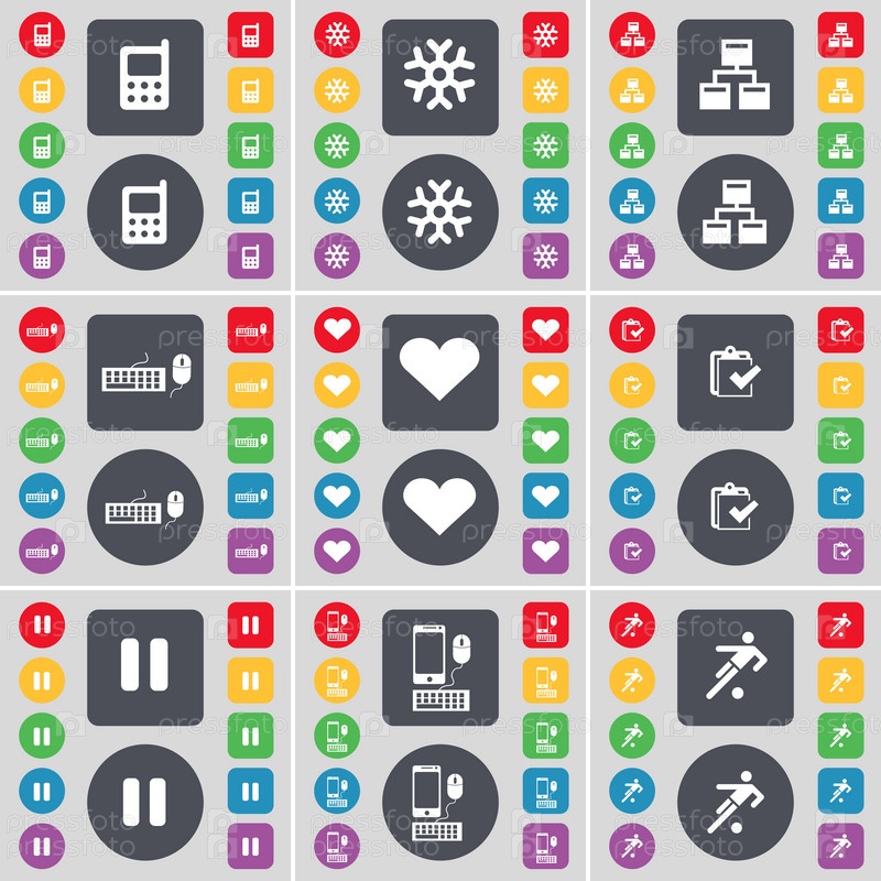Мобильный телефон, снежинка, сети, клавиатура, сердце, обследования, пауза, смартфон, Футбольный значок символа. Большой набор плоских, цветные кнопки для вашего дизайна. Вектор