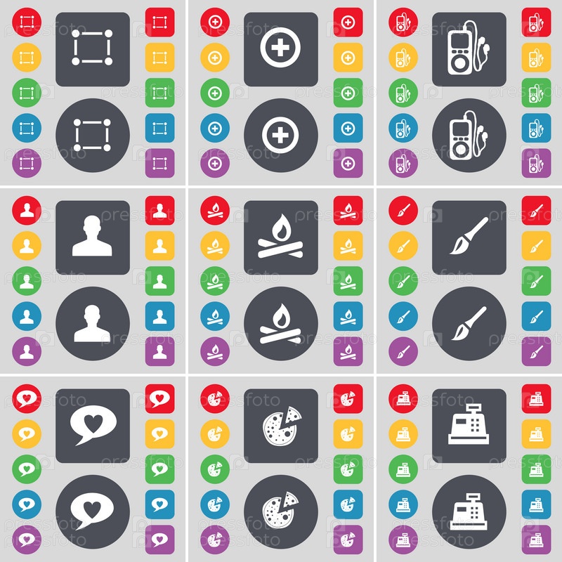 Рама, плюс, MP3-плеер, аватар, огонь, кисти, пузырь для чата, пицца, иконка символа кассового аппарата.Большой набор плоских цветных кнопок для вашего дизайна.Вектор