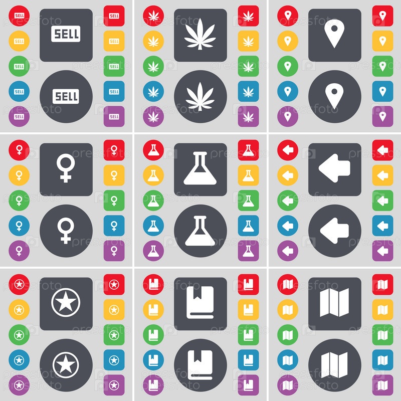 Продажа, марихуаны, контрольно-пропускной пункт, символ Венеры, фляга, стрелка влево, звезда, словарь, карта значок символа. Большой набор плоских, цветные кнопки для вашего дизайна. Вектор