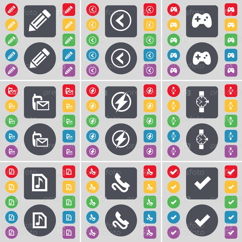 Карандаш, стрелка слева, геймпад, SMS, Флэш, наручные часы, музыкальные файлы, приемник, значок символа тик. большой набор плоских цветных кнопок для вашего дизайна. вектор