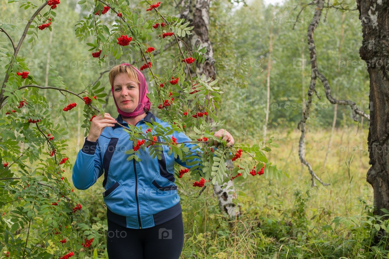 Женщина в осеннем лесу возле Рябины красной