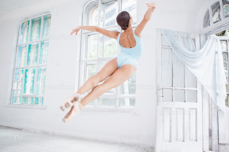 Современная балерина, прыжки на белом фоне