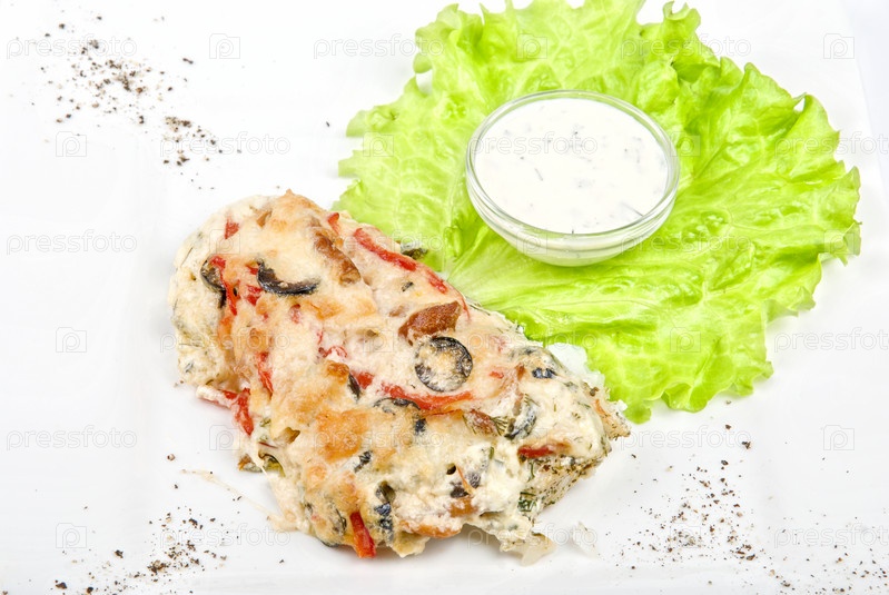 Запеченная рыба с овощами, изолировано на белом
